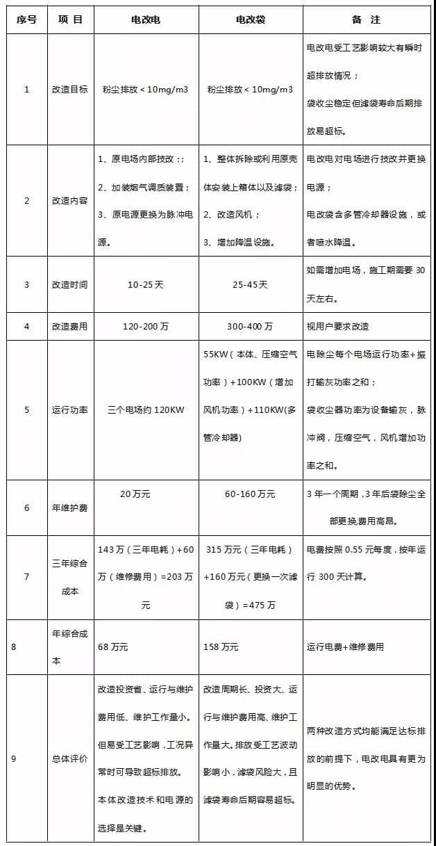 通过以2500t/d熟料生产线为例的除尘改造对比,我们来看电改电、电改袋的各自优缺点: