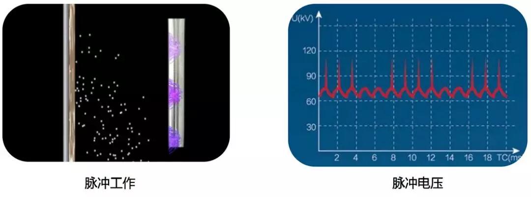 ▲ 峰值电压高,单位空间内被激发出的电子密度大,轰击飞灰粒子表面,使粒子的荷电量超过饱和电场荷电的极限,从而使粉尘获得更快的趋近速度,提高除尘效率。