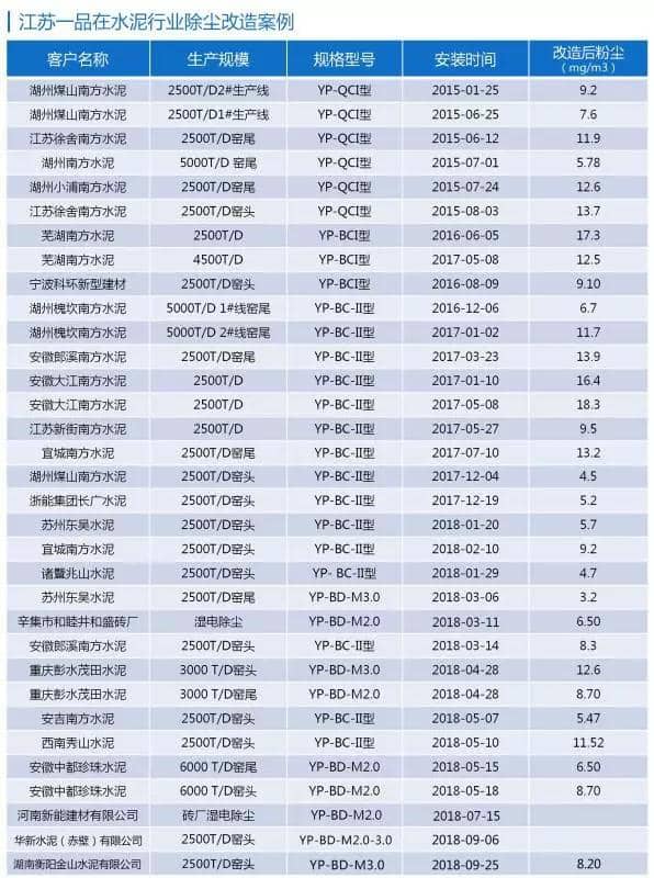 江苏一品的上述系统改造方案,通过对除尘器本体进行科学合理的技术改造,并将原有的控制电源根据电场顺序更换成江苏一品环保生产的系列“智能变频脉冲电源”,已对数十条水泥生产线进行了“达标排放”和“超低排放”改造,均达到了满意的预期效果。