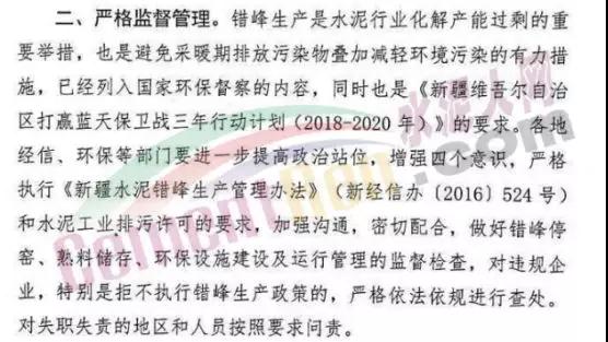 根据新疆环保厅、工信委、建设兵团环保局联合发布的《关于2018-2019年冬季水泥错峰生产的通知》相关要求,对违规企业、特别是拒不执行错峰生产政策的,严格依法依规进行查处。对失职失责的地区和人员按照要求问责。