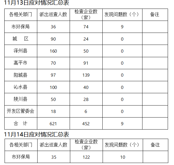 收到预警通知后,为确保所有应对措施能够落实到位,晋城市环保局紧急安排部署,分13个组,联合城区、泽州县、开发区环保部门,奔赴晋城市各重点区域进行巡查。截至14日16时,晋城市、县两级环保部门共检查企业574家,多数企业按照相关预案积极响应并执行预警应对措施,但仍有19家企业未完全落实应对措施。