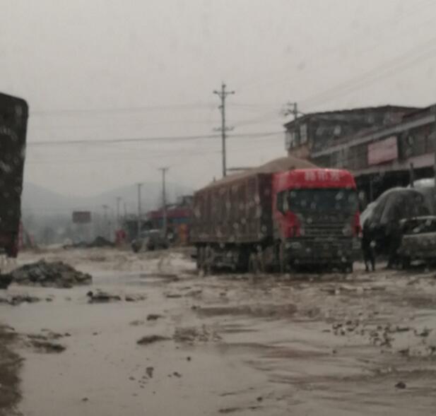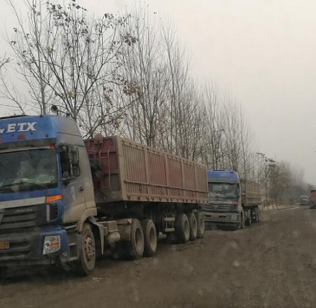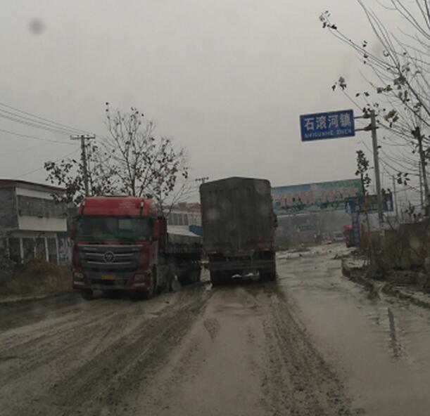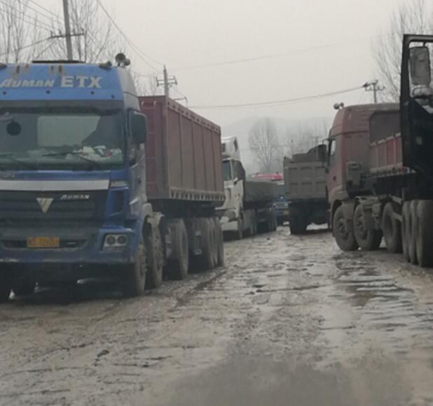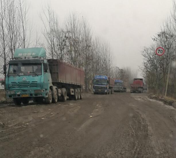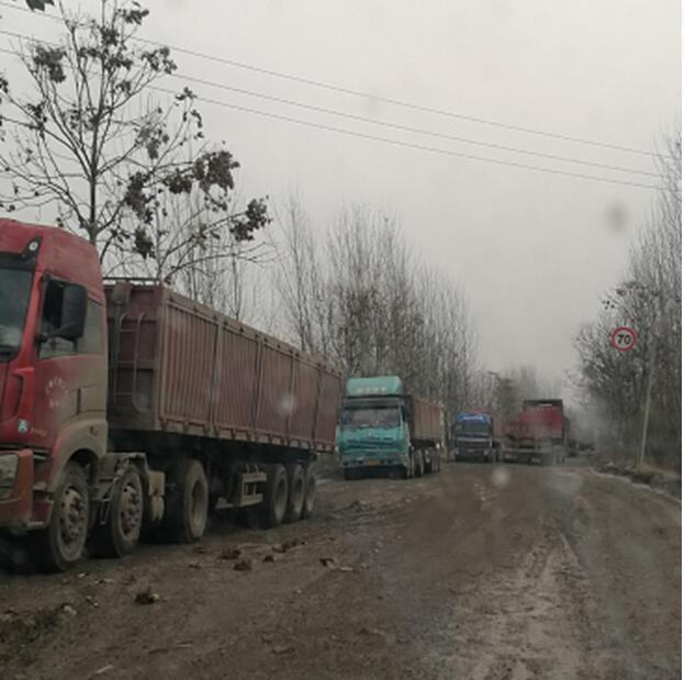 确山县石滚河镇的一条公路上,有一排排百吨王大货车和改装后八轮货车经过。道路多处被堵,修好的省级水泥公路多处被碾压成大泥坑。