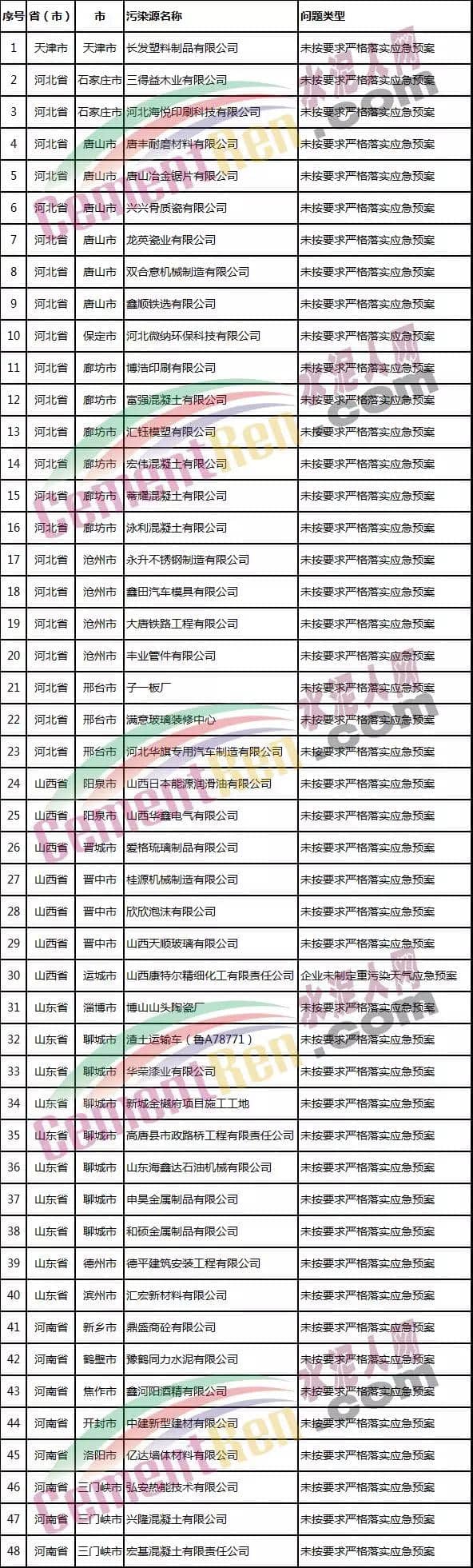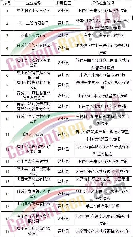 巡查发现的19家企业,未严格落实重污染天气应急预案停产、限产、停止公路运输等要求。