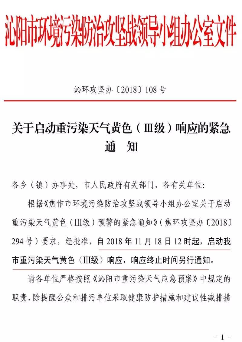 日前,河南沁阳市环境污染防治攻坚战领导小组办公室发布《关于启动重污染天气黄色(Ⅲ级)响应的紧急通知》(沁环攻坚办〔2018〕108 号)文件称,根据《焦作市环境污染防治攻坚战领导小组办公室关于启动重污染天气黄色(Ⅲ级)预警的紧急通知》(焦环攻坚办〔2018〕294 号)要求,经批准,自 2018 年 11 月 18 日 12 时起,启动沁阳市重污染天气黄色(Ⅲ级)响应,响应终止时间另行通知。请各单位严格按照《沁阳市重污染天气应急预案》中规定的职责,除提醒公众和排污单位采取健康防护措施和建议性减排措施外,还要结合新修订的 2018 年重污染天气应急减排措施项目清单,严格落实Ⅲ级响应措施。各乡(镇)办事处和有关部门要督导落实以下措施,确保全社会 SO2、NOX、PM、VOCs 减排比例均达到 10%以上: