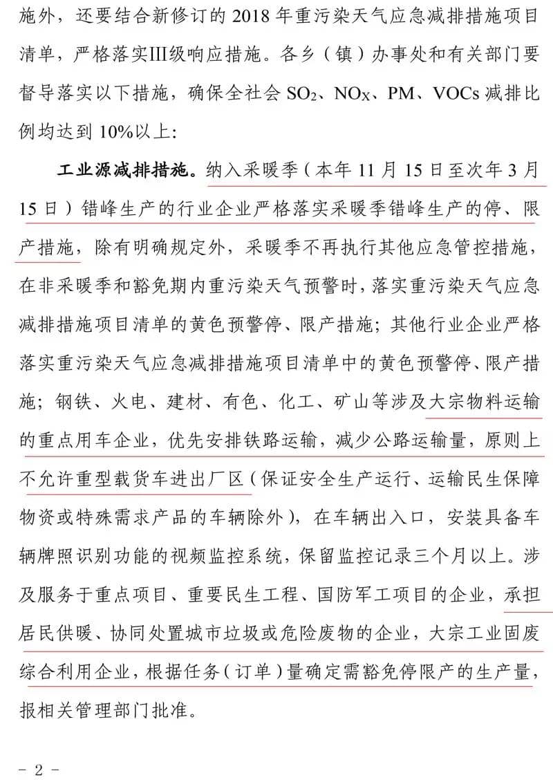 其他行业企业严格落实重污染天气应急减排措施项目清单中的黄色预警停、限产措施;钢铁、火电、建材、有色、化工、矿山等涉及大宗物料运输的重点用车企业,优先安排铁路运输,减少公路运输量,原则上不允许重型载货车进出厂区。承担居民供暖、协同处置城市垃圾或危险废物的企业,大宗工业固废综合利用企业,根据任务(订单)量确定需豁免停限产的生产量,报相关管理部门批准。