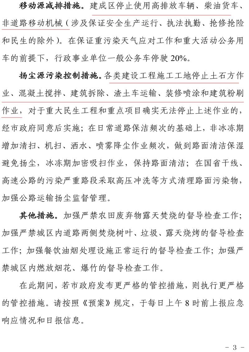 移动源减排措施。建成区停止使用高排放车辆、柴油货车、非道路移动机械等。