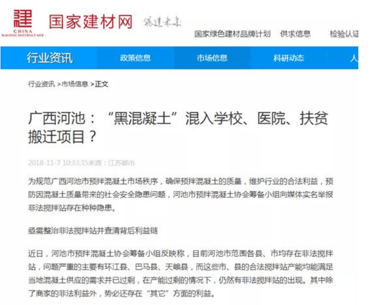 2018年11月6日,一篇题为《广西河池:“黑混凝土”混入学校、医院、扶贫搬迁项目?》的报道,揭开了河池市“黑混凝土”的面纱。该“曝光”,竟然是来自河池市预拌混凝土协会筹备小组(下称混凝土协会)的实名举报!