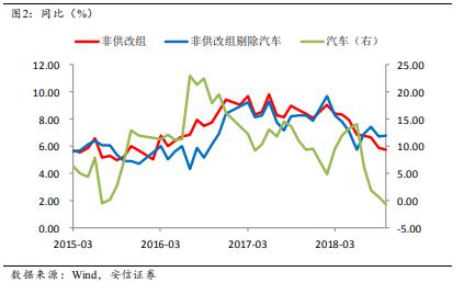 作为与真实经济更为相关的非供改组的走势值得进一步深入探讨。汽车行业占比较大,而且今年以来波动较大,可能对整体数据有干扰。如果我们把非供改组剔除汽车以后,实际上非供改组的生产走势自7月份以来保持平稳。