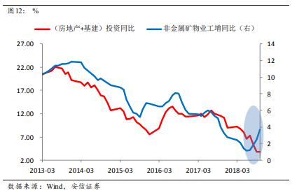 但随后我们看到,钢铁价格和生产都在明显走强,这意味着需求是较强的;而另一方面基建投资在明显走弱,这可能意味着房地产投资可能要好于预期。一个可能的解释是,房地产企业2018年资金紧张,但又想加大土地购置,因此房企拿地后,赶紧开工至总投资额的25%之后马上办理预售证后开盘销售,尽快回款,但之后缓慢施工。一般来说,房屋总投资25%的进程都已经建至地面以上,打基础的部分大概要消耗钢筋水泥的一半左右,这使得水泥包括钢铁的消耗量大增。