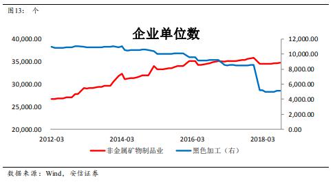 第一个解释还需要更多的证据。关于第二个解释,我们知道钢铁煤炭的去产能盛行于2016-2017,但水泥行业的动作要晚,去年才颁布了《水泥行业去产能行动计划(2018~2020)》。特别的,从企业单位数这个指标来看,水泥行业直到2017年的单位数还在增长,而钢铁、有色、化工等行业的企业单位数从2015年以来都是在下降的。因此,水泥行业的供给侧改革可能导致幸存者偏差的问题,使得统计数据高估。