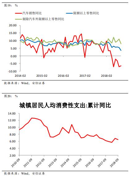 今年以来社会消费品零售总额和限额以上零售同比下滑明显,很大程度上是受到汽车销售大幅下滑的影响。如果剔除汽车部分,限额以上零售的其他部分同比增速甚至略有上行。但10月汽车销售跌幅收窄,同时限额以上零售增速明显放缓,使得去除汽车的其他消费出现了下滑。但这个下滑是否持续还需要进一步观察。另外,从城镇居民人均消费支出这个指标上看,暂时没有明显看到消费有大幅下滑的迹象。