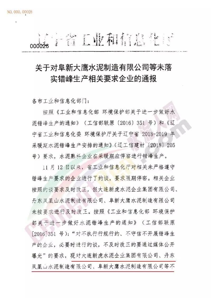 日前,辽宁省工业和信息化厅发布《关于对阜新大鹰水泥制造有限公司等未落实错峰生产相关要求企业的通报》,通报文件称,按照《工业和信息化部 环境部关于进一步做好水泥错峰生产的通知》(工信部联原(2016)351号)和《辽宁省工业和信息化委 环境保护厅关于辽宁省2018-2019年采暖期水泥错峰生产安排的通知》(辽工信建材(2018)205号)要求,水泥熟料在采暖期应停窑进行错峰生产。
