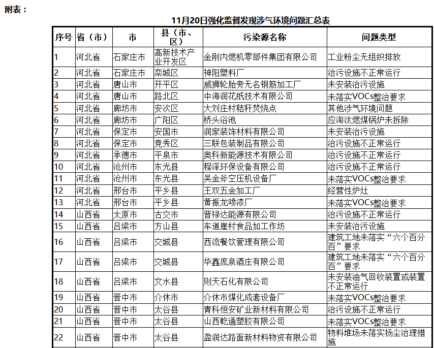 四、工业企业未安装大气污染防治设施问题20个。