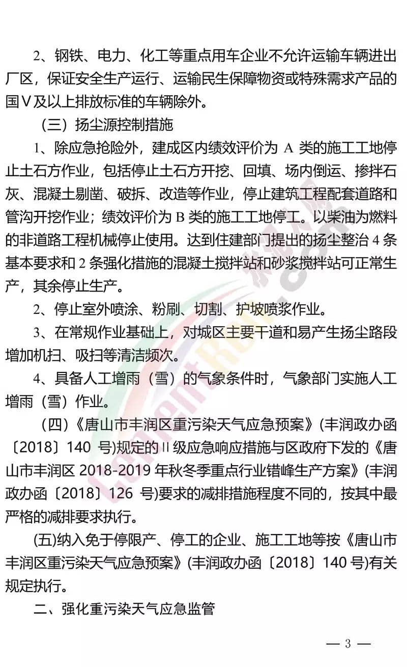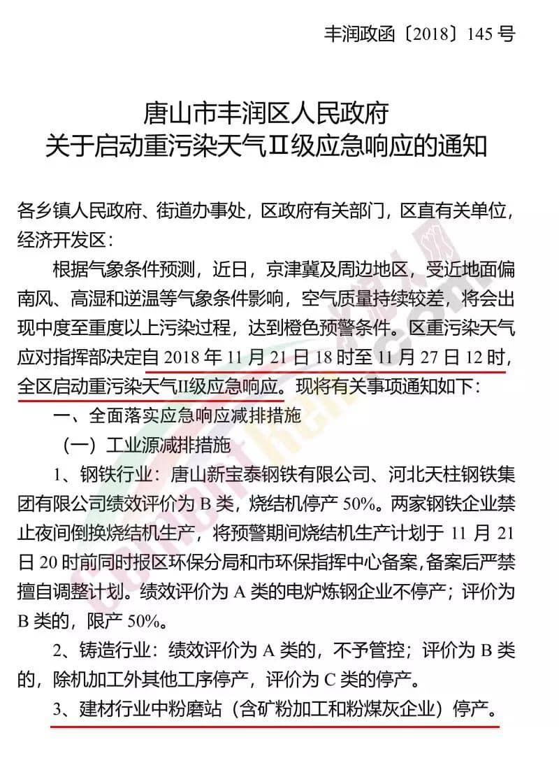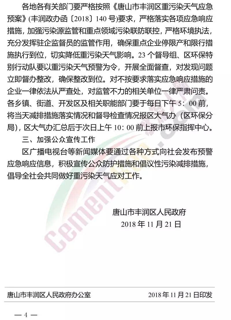 水泥人网最新消息,昨日(21日)河北省唐山市丰润区人民政府发布《关于启动重污染天气Ⅱ级应急响应的通知》称:根据气象条件预测,近日,京津冀及周边地区,受近地面偏南风、高湿和逆温等气象条件影响,空气质量持续较差,将会出现中度至重度以上污染过程,达到橙色预警条件。丰润区重污染天气应对指挥部决定自2018年11月21日18时至11月27日12时,全区启动重污染天气Ⅱ级应急响应。