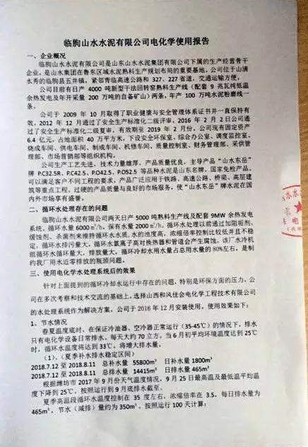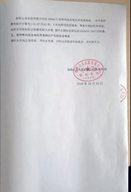 四、综上,临朐山水水泥有限公司自使用400m³/h的和风佳会电化学处理系统,一年节省的费用约为76.76万元/年,带来可观的经济效益。水质各项指标较以前都有较大改善,循环水指标全部达到GB50050-2007的标准。