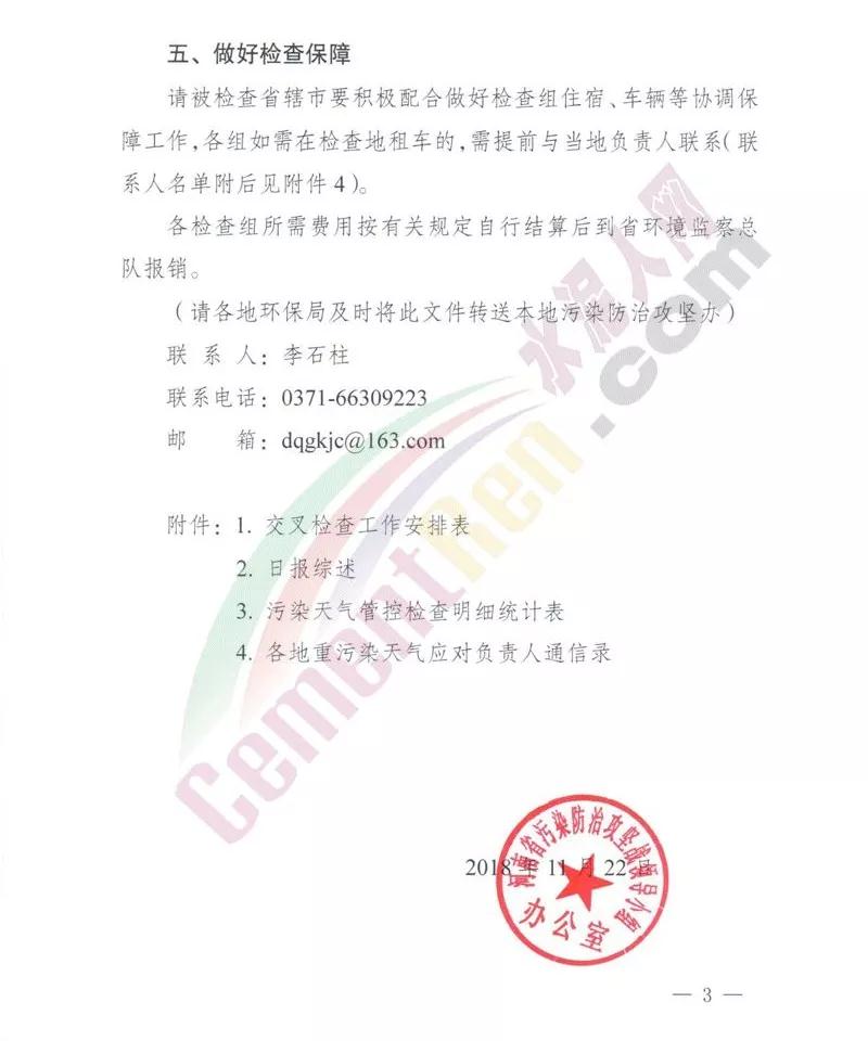 水泥人网最新消息,昨日(22日)河南省污染防治攻坚战领导小组办公室发布《关于加强重污染天气应急管控及开展第一轮交叉检查工作的通知》(豫环攻坚办【2018】56号文件。文件称,根据河南省环境监测中心最新天气形势分析及多部门会商研判,11月23日至25日河南省没有持续较好的大气扩散条件,北部及京广线沿线以东区域有持续轻中度污染过程,预测郑州、开封、平顶山、安阳、鹤壁、新乡、焦作、濮阳、许昌、商丘等10个省辖市将出现重度污染过程;28日至30日全省还将出现一个污染过程。