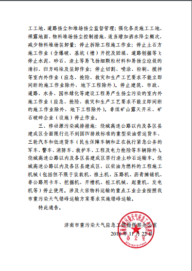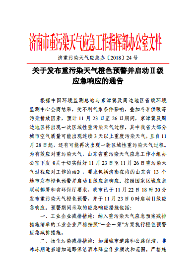 为有效应对重污染天气,山东省重污染天气应急工作小组办公室下发《关于切实做好11月23日至11月26日重污染天气过程应对工作的函》,要求包括济南在内的山东省13个地市发布橙色预警并启动Ⅱ级应急响应。按照国家区域应急联动部署和省环保厅要求,济南已于11月22日18时30分发布重污染天气橙色预警,并于11月23日0时启动Ⅱ级应急响应。