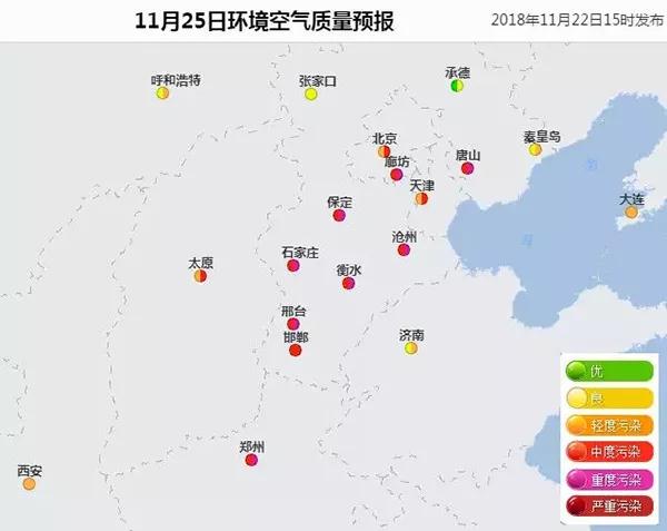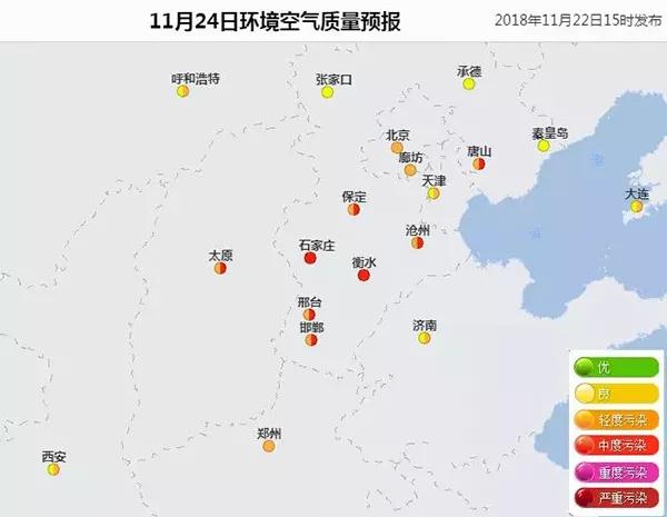 预计11月24日~27日,扩散条件持续转差,河北省中南部和东部地区可能出现中度至重度污染过程。