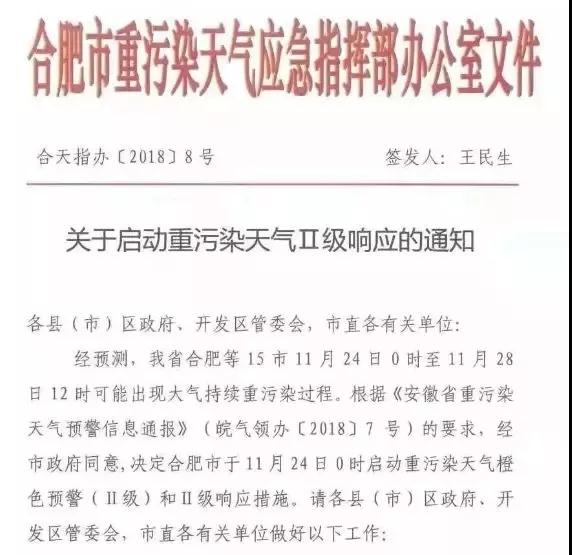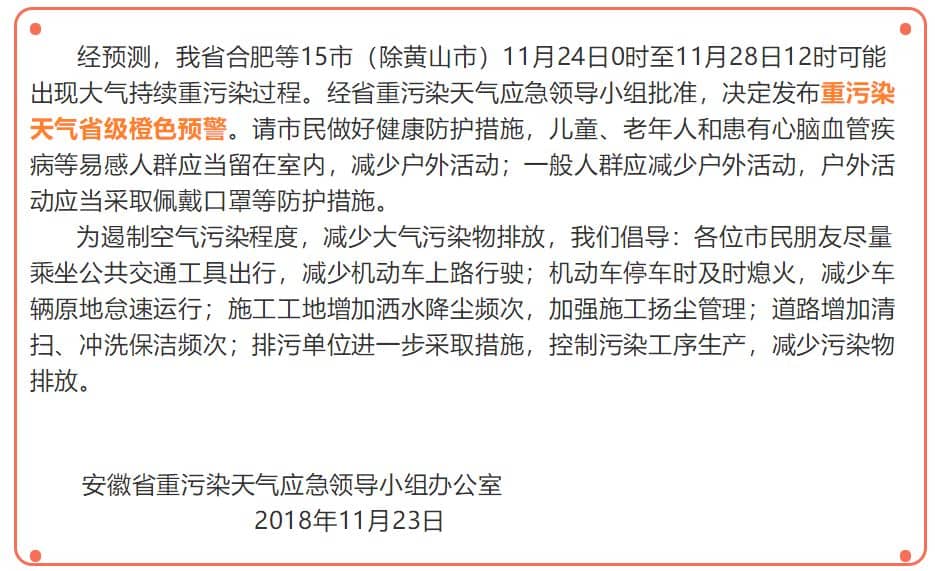 经预测,安徽省合肥等15市(除黄山市)11月24日0时至11月28日12时可能出现大气持续重污染过程。