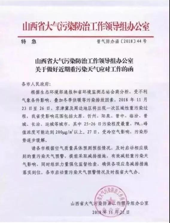 27日,受冷空气影响,污染形势逐步缓解。山西省大气污染防治工作领导小组办公室下发特急函,要求各市要根据空气质量具体预测预报情况,及时启动相应级别的重污染天气预警,提前采取减排措施,有效减轻重污染天气影响。