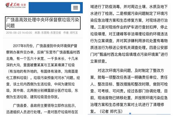 2017年8月,中央第三环境保护督察组多次接到群众举报,反映东营市广饶县甄庙村土坑非法填埋大量化工废液、医疗垃圾、生活垃圾等,严重污染周边环境。东营市在调查后,向督察组反馈称,广饶县组织相关部门开展了调查,共清运77.95吨医疗废物和400余吨生活垃圾。2018年6月15日,广饶县公示交办问题已完成整改并销号,《东营日报》也对有关情况进行了宣传报道。