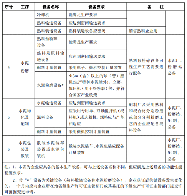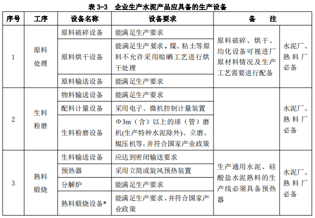 第七条 企业生产水泥产品应具备本条款规定的基本生产条件,内容包括:生产设施和检验设施、生产设备和检验设备,具体要求见表3-2至表3-4。