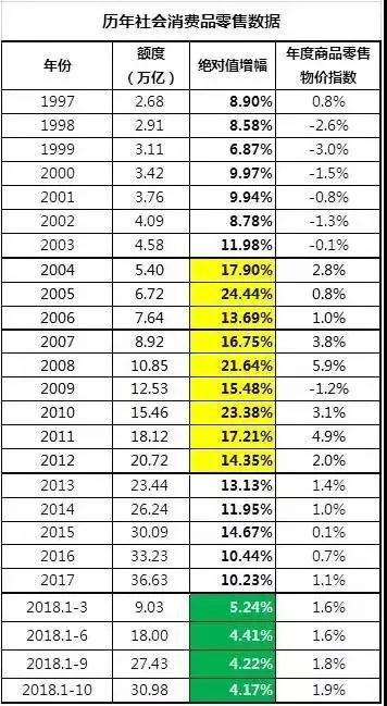 历年社会消费品零售数据显示额度方面也有所下降,绝对值增幅今年较前几年有所下降。年度商品零售物价指数较前五年有所上涨, 详情见下表: