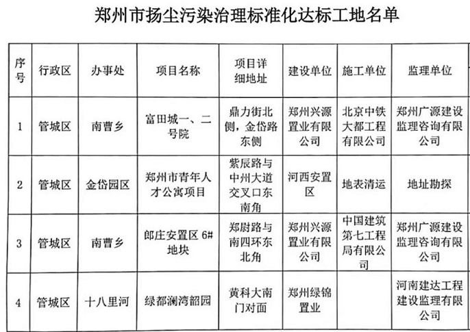 昨日,市控尘办先后来到郑东新区龙湖办事处郑东新龙湖区金融岛外环建筑群组团五工程,管城区南曹乡富田城一、二号院等10个扬尘治理达标工地,集中发放“绿牌”。首批10个工地符合挂绿牌条件,公布如下: