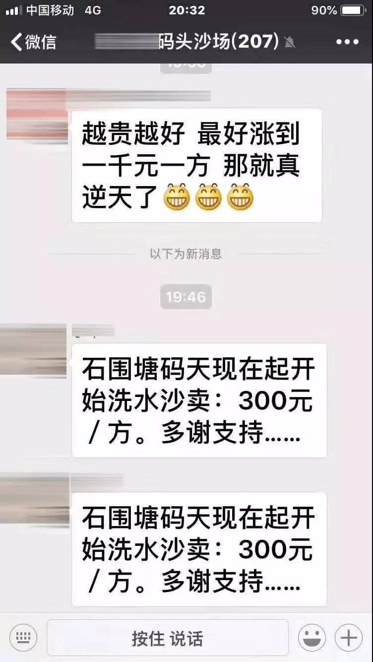 昨日(27日)下午17点35某码头沙厂通知晚七点上调水洗沙价格250元/方,晚19点46分又再次通知水洗沙价格执行300元/吨。
