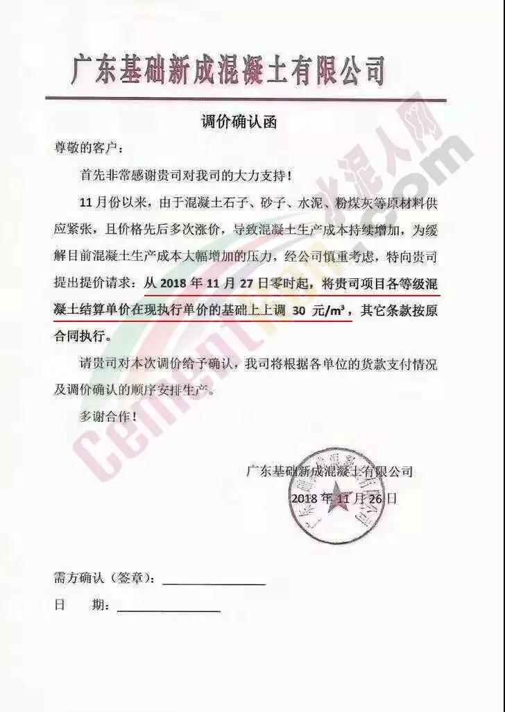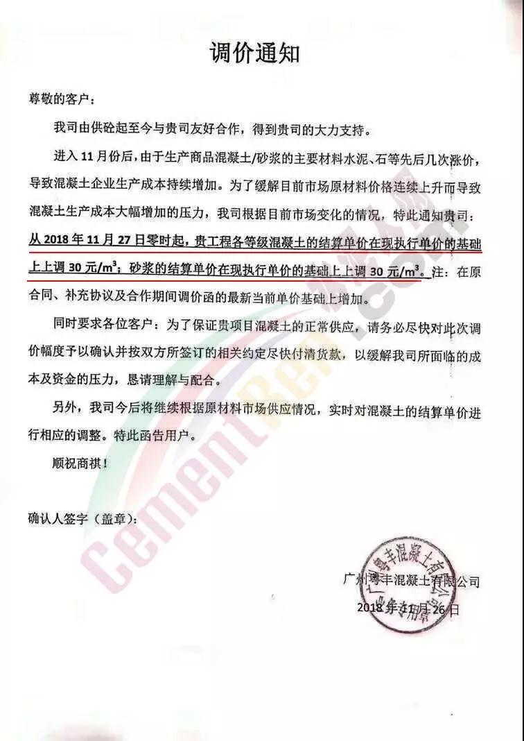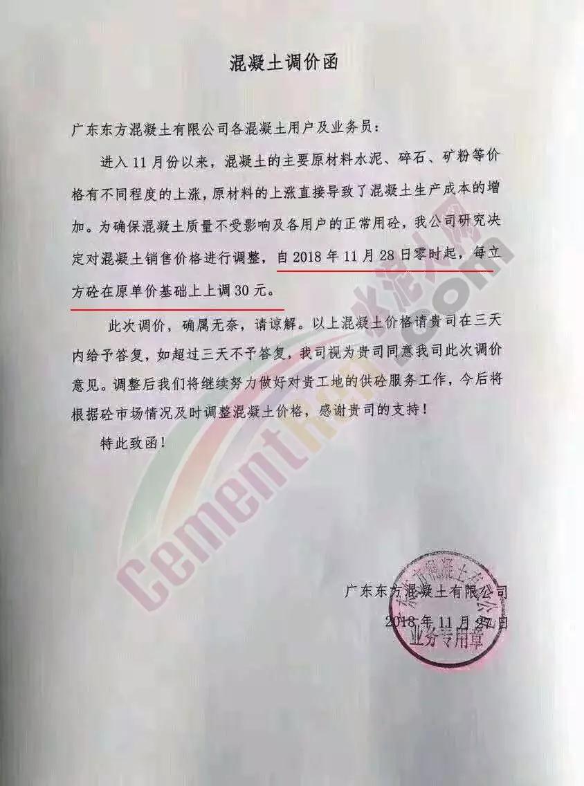 同期,广东区域多家商混企业发通知提价。其调价通知称,进入11月份后,由于生产商品混凝土/砂浆的主要材料水泥、石等先后几次涨价,导致混凝土企业生产成本持续增加。