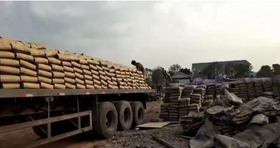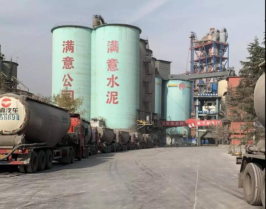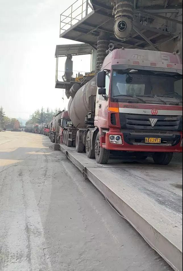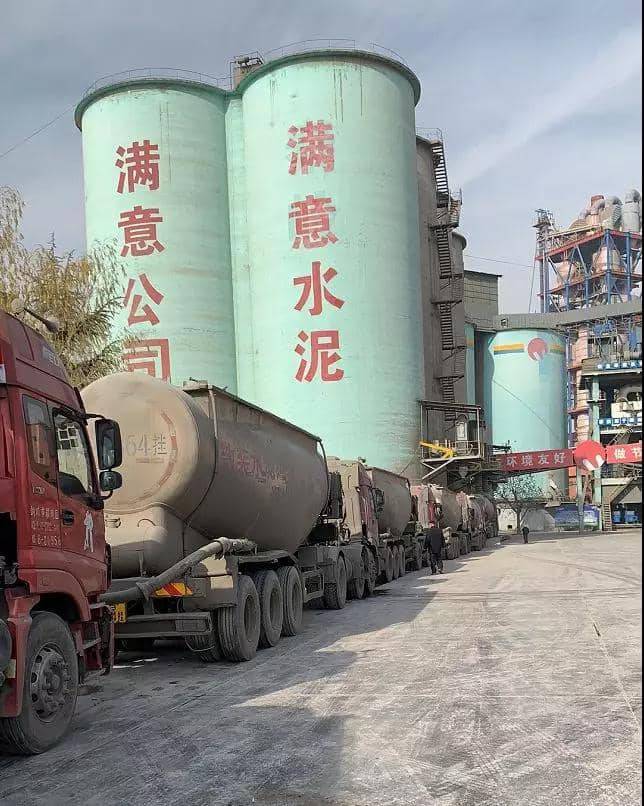 门前排队车辆有条不紊进入工厂灌装水泥