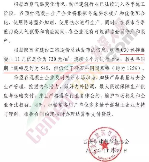 据了解,根据陕西省建设工程造价总站发布的信息,西安C30预拌混凝土11月信息价为720元/立方米,且已经连续6个月进行上调,较上年同期上调54%,但仍低于砂石料同期涨幅,砂石料同期涨幅约为125%。西安市建筑节能协会提到希望各混凝土企业及时关注市场动态。