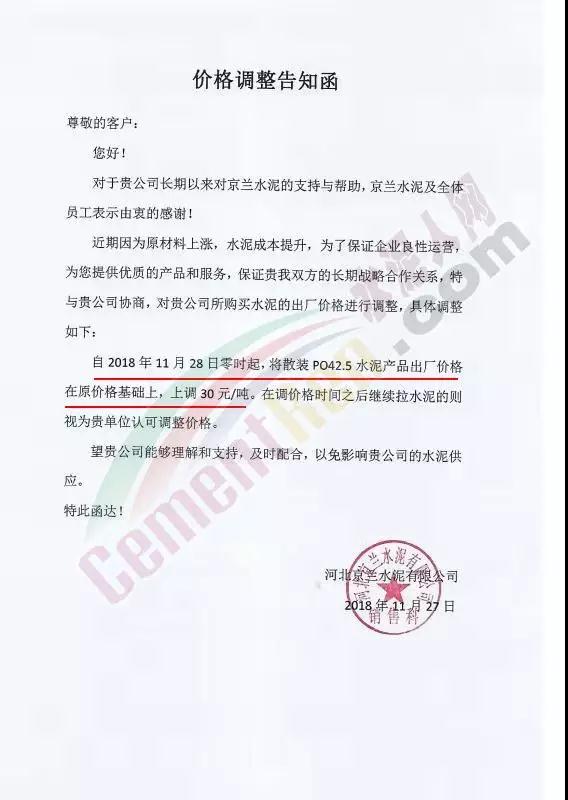 近两日京津冀地区又迎来一波涨价潮。区域主导企业金隅水泥经贸公司石家庄、邯郸、保定等公司陆续发布了调价通知。石家庄区域京兰水泥、曲寨水泥等主要品牌亦同期发通知上调水泥价格。调价函如下: