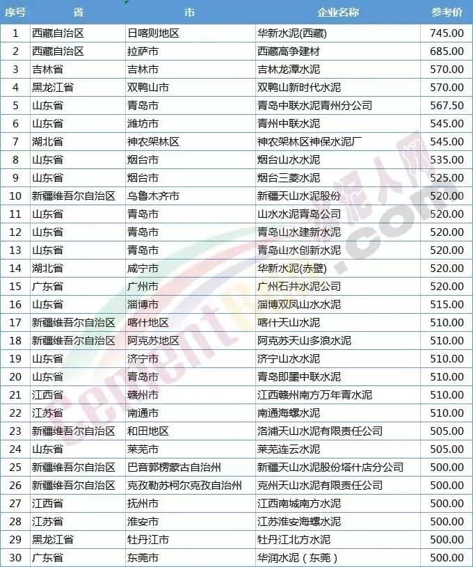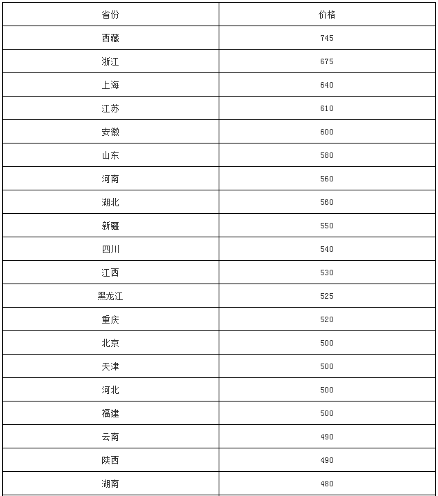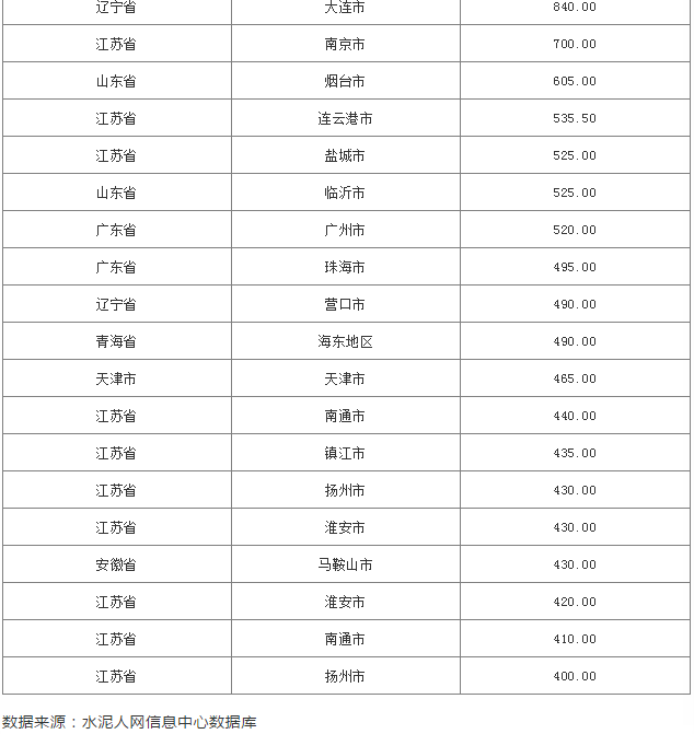 水泥人网信息中心监控数据显示,PO42.5散装水泥最高价格还是在西藏高原,最高价格为745元,第二名为浙江区域,最高价为675元/吨。