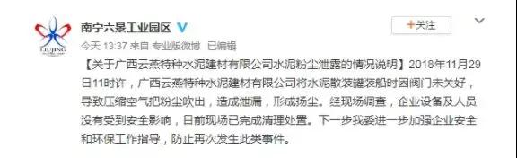 说明指,2018年11月29日11时许,广西云燕特种水泥建材有限公司将水泥散装罐装船时因阀门未关好,压缩空气把粉尘吹出,造成泄漏,产生扬尘。经现场调查,企业设备及人员没有受到安全影响,目前现场已完成清理处置。