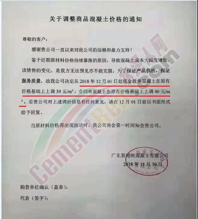 日前,广东新港兴混凝土有限公司发布了《关于调整商品混凝土价格的通知》通知称鉴于近期原材料价格持续暴涨的原因,导致混凝土成本大幅增加。该情势的变化,是企业无法预见亦不能克服的。为了保证产品供应,保证服务质量。公司决定从12月1日起现金散单混凝土在原有价格基础上上调30元/立方米,合同单混凝土在原有价格基础上上调40元/立方米。