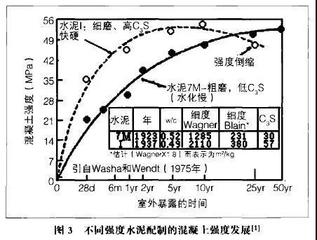美国的Withy在威斯康辛大学从1910年开始了50年水泥净浆、砂浆和混凝土的实验计划,浇筑了室内和室外混凝土。分别于1910年、1923年和1937年3个不同时间成型了5000多个试件。Washa和Wendt于1975年发表了这些试件观测50年的结果。结果是:1923年用Blaine细度为5775px2/kg的水泥配制的混凝土28天强度为21MPa,25年强度达到52MPa;1937年用当时的快硬水泥配制的混凝土28天强度为35MPa,5年达到53MPa,10年后强度开始倒缩,25年强度就倒缩至45MPa,比水化慢的混凝土25年强度还低。当时的快硬水泥与当今美国的I型水泥和II型水泥矿物组成与细度相当(C3S为57%,勃氏比表面积为380㎡/kg,我国常用水泥也如此)见图3。