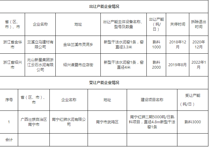 兰溪立马建材有限公司、兆山新星集团浙江云石水泥有限公司熟料产能出让公示