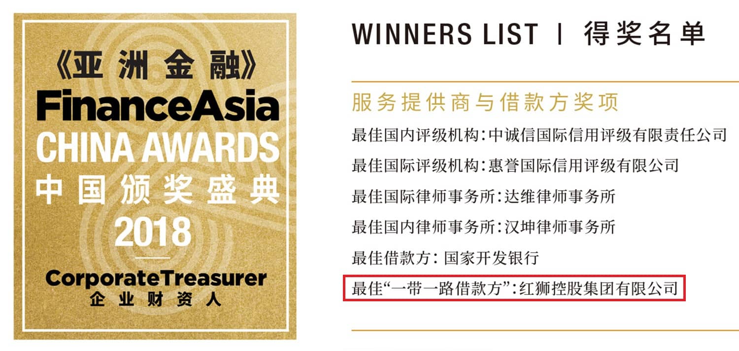 红狮集团发行的2018年“一带一路”公司债券,荣获“最佳一带一路借款方”奖(Best Belt & Road Borrower),与中国国际金融股份、国家开发银行、中国银行、高盛集团、汇丰银行、中诚信评级、国泰君安证券、中信证券等金融机构、银行、投资银行及中介机构等一起分享了各项大奖。