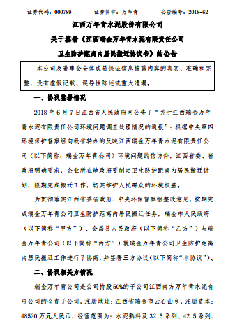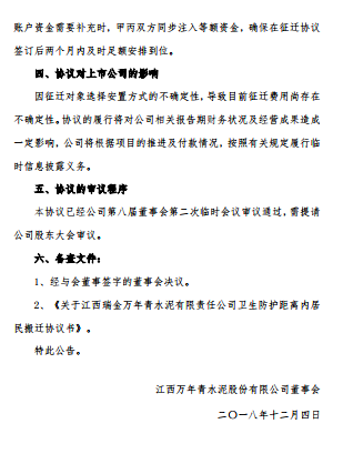 关于签署《江西瑞金万年青水泥有限责任公司卫生防护距离内居民搬迁协议书》的公告