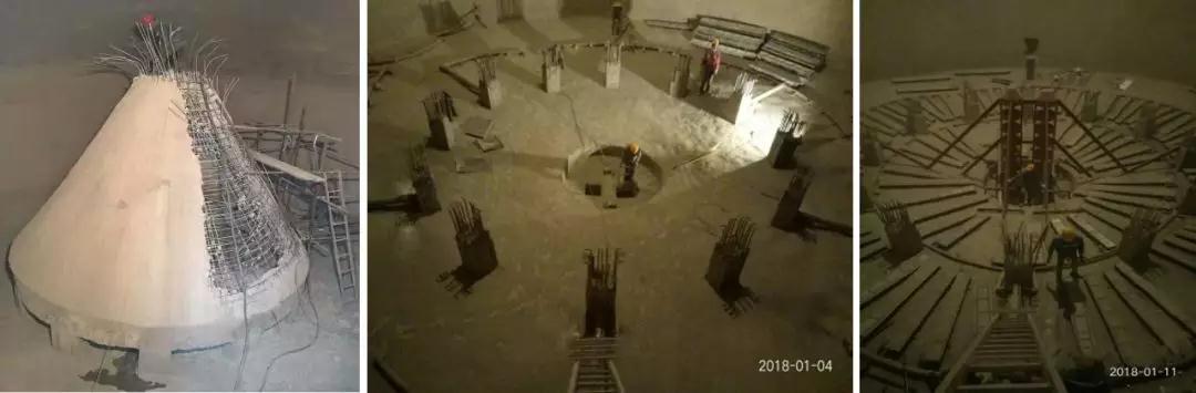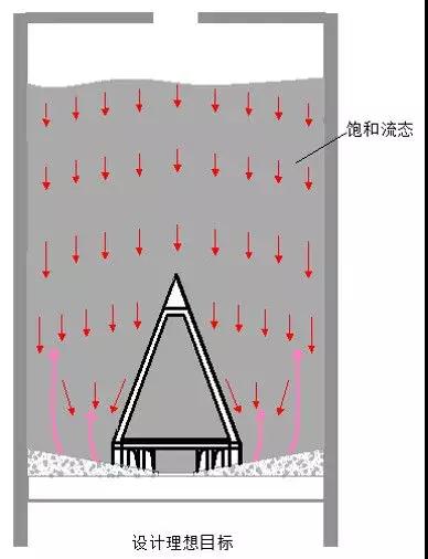 1. 由于全行业对粉体动力学理论缺乏清晰完整的研究掌握,为了避免全空库的中心漏斗流模式,一般在库底都采用大型减压锥设计,以前期理论上通过改变库底罗茨风机多级环形斜槽阵的气动流化作用外扩到库底部外壁,进而实现环库的活化卸放,如图2所示。