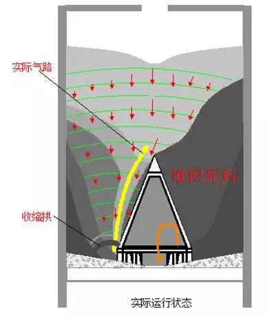无论新库还是重新清库后的存储,事实其料路发展都像立鸡蛋易倒一般,极易形成不断自我放大的多点气路偏移聚合作用(中部多股分散漏斗流),如图4所示。最后必然发展形成少数单点料路日益增长发展的对应死料偏库现象,远非人们自以为是气路铺设布局不均,气箱磨损失效,库壁及减压锥面不光滑,人员操作不当等等原因。