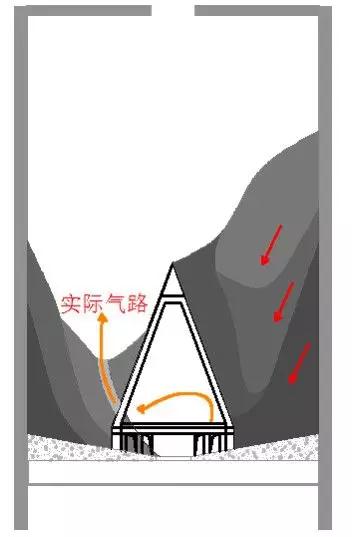 然而,人们都忽视了库内粉体分层重力拱产生的料重外扩集肤叠加效应,实际上库内密度分布是外壁硬内空软,偏偏低密度的外加空气必然走软不走硬,因此注定了整个系统处于偏移发散性力学传导模式,如图3所示。