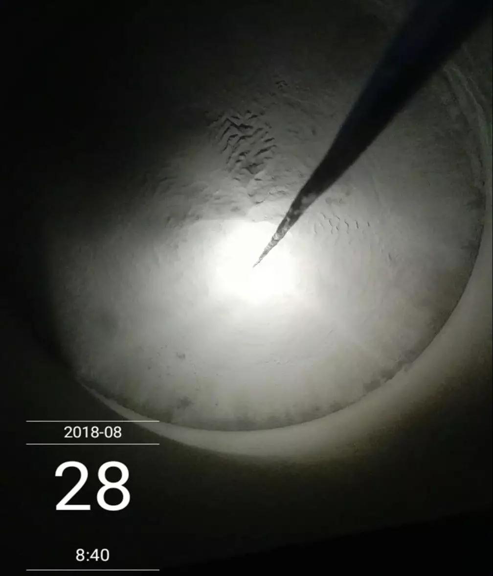3. 清库就是因为死料一步步积累而来,事实上在没有彻底堵死的时候,我们的水泥库都是严重带病运行的。等到必须清库时,无论是人工方式还是机器方式,减压锥的存在反而变成了巨大的料路疏通障碍;因为大量死料多数处于板结硬化状态,清理下来的往往是流动性极差的块粉混合料,其疏通死角有时不得不靠人加以处理,如图5所示,在高位堆积受力极不稳定的库内环境,这正是诱发重大伤亡事故的原因所在。