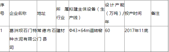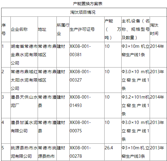 葛洲坝石门特种水泥有限公司年产60万吨白色硅酸盐水泥生产线技改项目产能置换方案已于2014年由常德市经信委(常经信[2014]54号)上报我委确认(湘经信产业函[2014]345号),但置换方案未予公示和公告。按照《国务院关于化解产能严重过剩矛盾的指导意见》(国发〔2013〕41号文件)要求,于2018年11月20日至11月29日,在我厅网站公示了葛洲坝石门特种水泥有限公司年产60万吨白色硅酸盐水泥生产线技改项目产能置换方案(见附表),公示期间无异议,现予以公告。