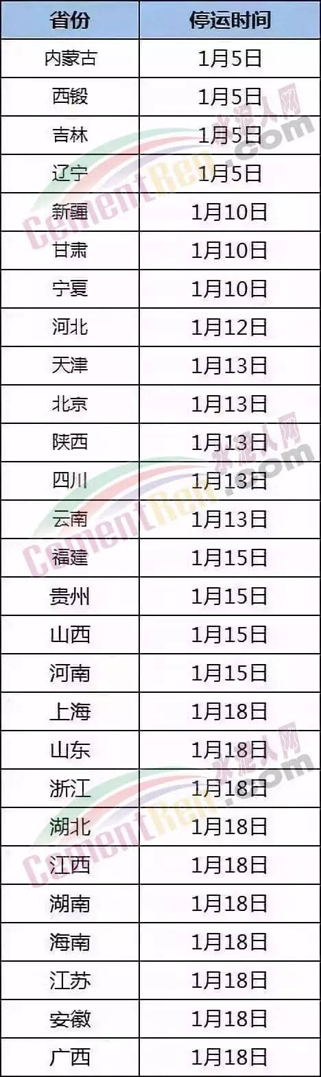 内蒙古,西藏,吉林,辽宁等地1月5日停运,新疆,甘肃,宁夏等地1月10日停运。河北1月12日停运,天津,北京,陕西,四川,云南等地1月13日停运。福建,贵州,山西,河南等地1月15日停运。上海,山东,浙江,湖北,江西,湖南,海南,江苏,安徽,广西等地1月18日停运。