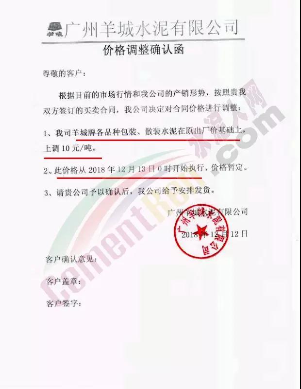 广州羊城水泥有限公司价格调整确认函称,根据目前的市场行情和公司的产销形势,公司决定对合同价格进行调整,自今日(12月13日)0时起公司羊城牌各品种包装、散装水泥在原出厂价基础上上调10元/吨。