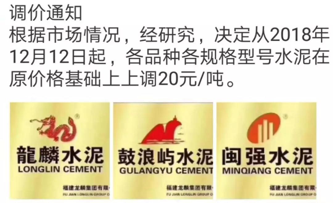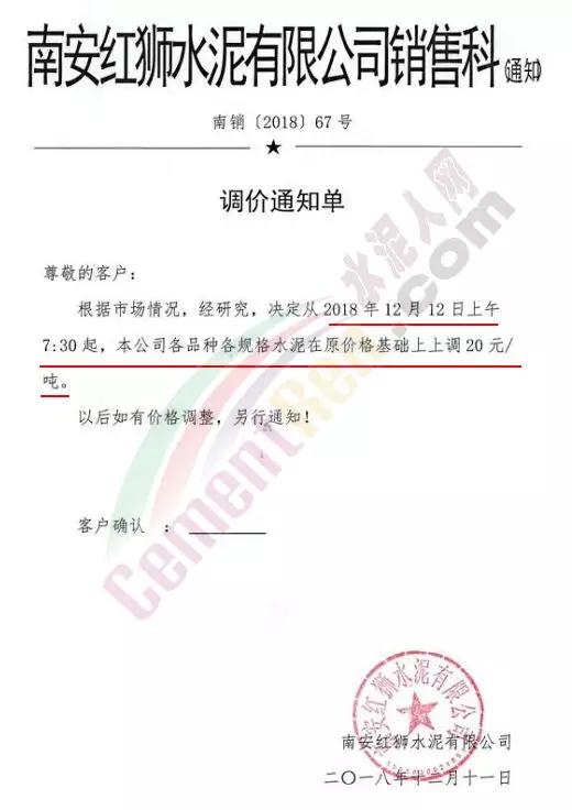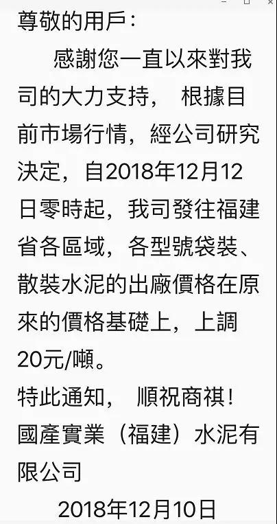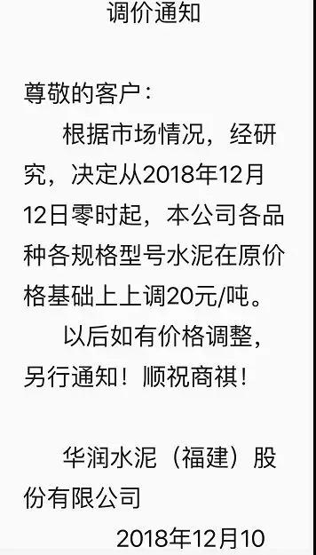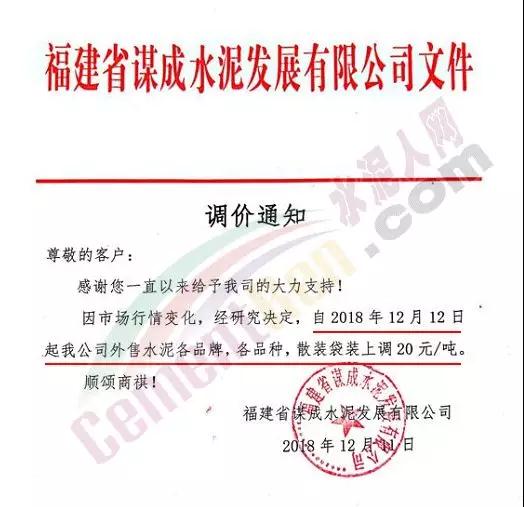 基于目前市场行情,结合我司实际情况,经我公司研究决定,自2018年12月12日零时起,我公司发往福建省全区域的各品牌、品种袋装、散装水泥的出厂价格在原有基础上上调: 20元/吨。