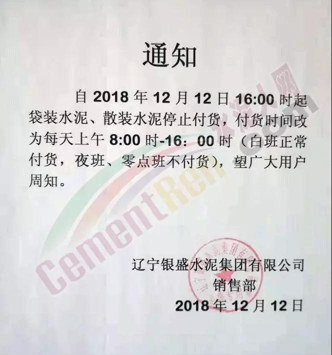 辽宁银盛水泥集团有限公司销售部昨日(12日)发通知称,自当日下午16点起袋装水泥、散装水泥停止付货,付货时间改为每天上午8时至下午16时。白班正常发运,夜班和零点班不再发货。此前蒙东水泥也曾发布类似停供通知。由此可见东三省区域水泥发货进入严冬淡季。
