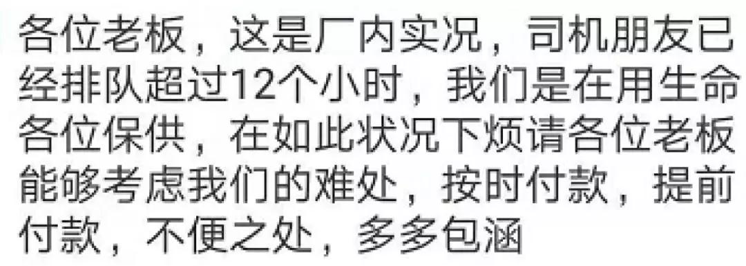 东北市场冰冻了,华南市场却还是一片火热。热销状况未有丝毫减弱。经销商发消息提示下游客户:司机排队已经超过12小时,经销商是用“命”在保供。希望经销商能按时付款、提前付款。